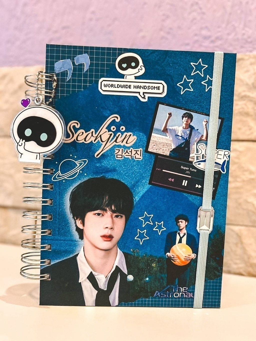 Caderno tamanho A5 com a capa personalizada com referências ao nosso worldwide handsome